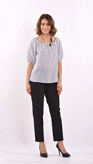 Блуза расширенная к низу с горловиной собранной на кулиску и резинкой на рукаве.