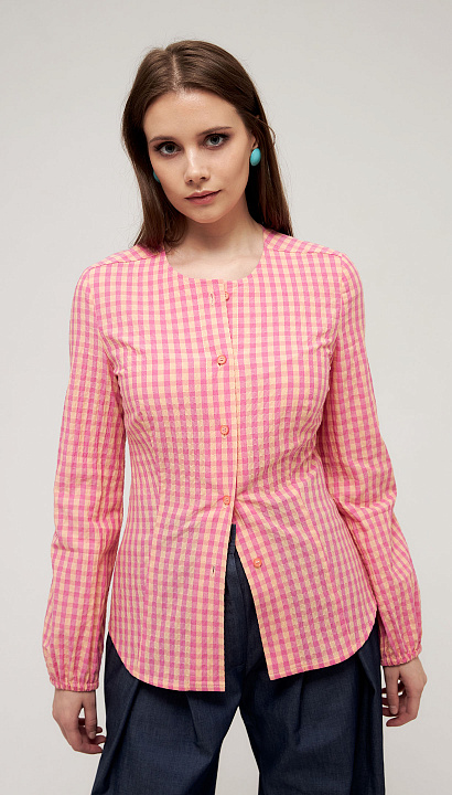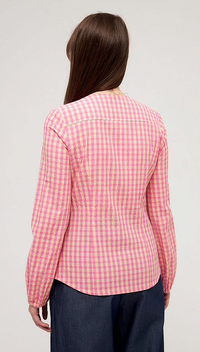 Розовая клетчатая блуза с кокеткой и длинными рукавами