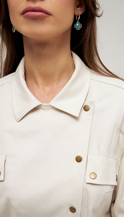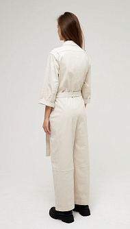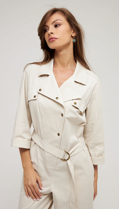 Широкий объемный комбинезон с косой застёжкой и клапанами на кнопках, поясом и карманами в боковом шве.