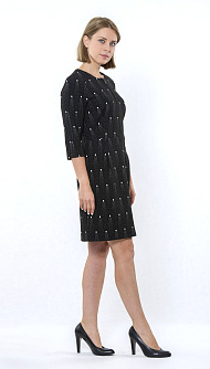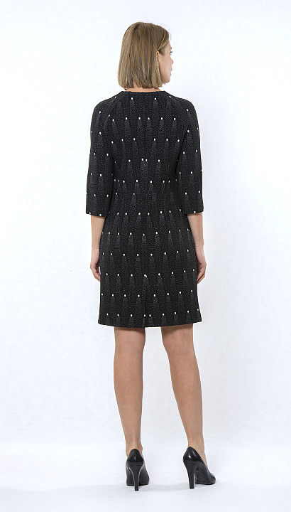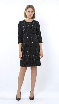 Трикотажное платье, отрезное по талии выше колена спереди на молнии, рукав 3/4 Цвет: чёрный горох Состав:65% полиэстер 34% вискоза 1% эластан