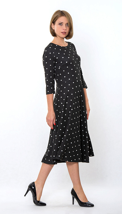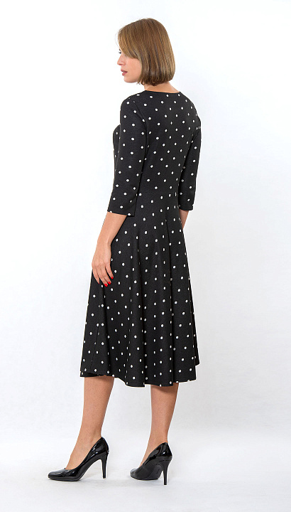 Трикотажное платье отрезное по талии, юбка полуклёш, рукав 3/4 Цвет: чёрный в горох Состав:70%полиэстер 29%вискоза 1%эластан