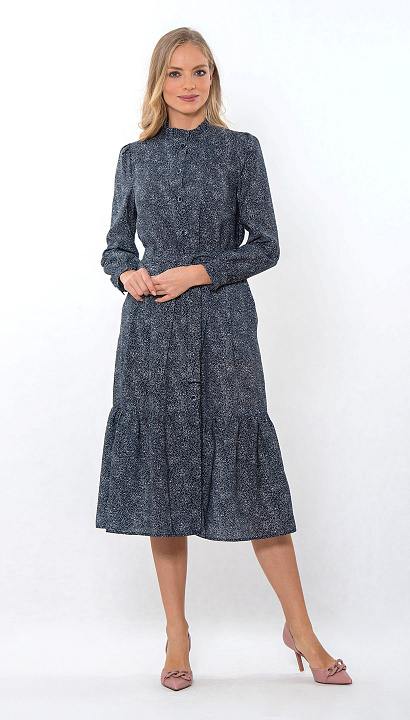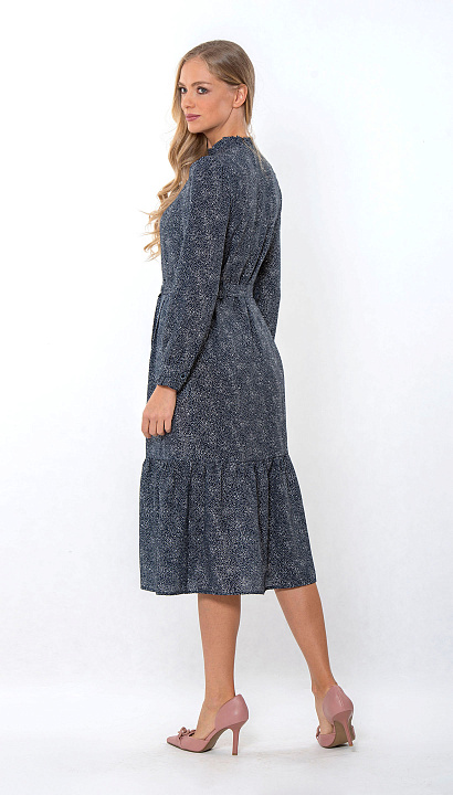 Платье-халат с застёжкой на пуговицах, с воланом , с длинным рукавом. Горловина и манжеты украшены рюшей. В боковых швах карманы. По талии пояс. Цвет:синий Cостав:80%вискоза 20%нейлон