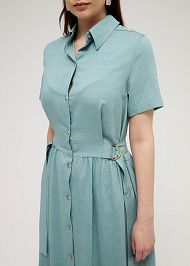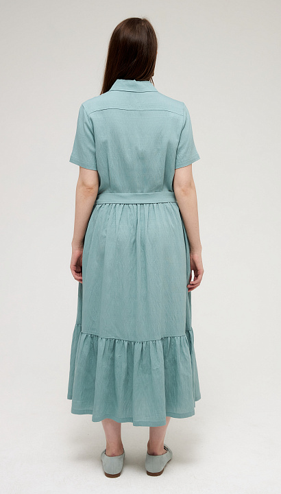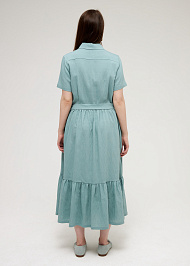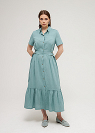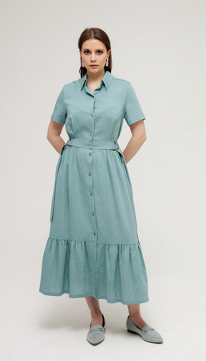 Платье отрезное по талии мятного цвета с коротким рукавом, с застёжкой спереди на пуговицах, с воланом внизу и поясом на талии. Цвет : мята Состав:88%вискоза 12%нейлон