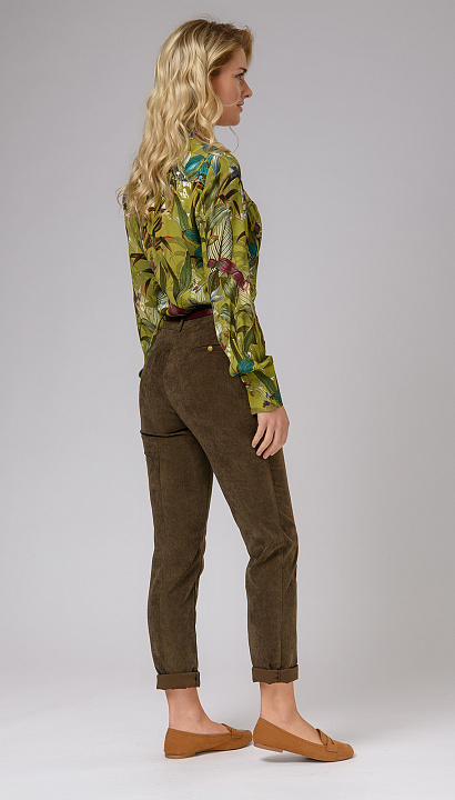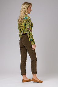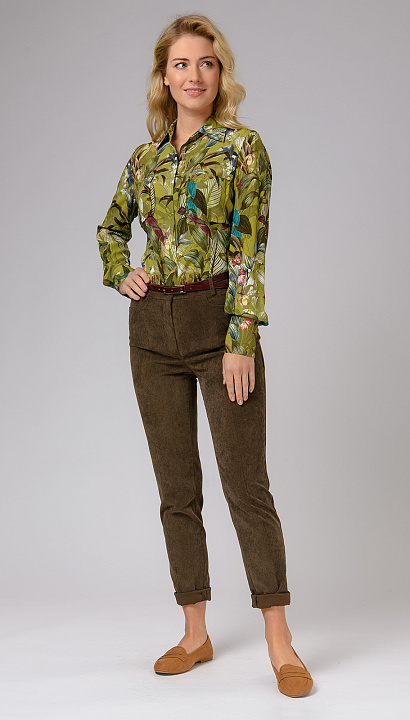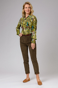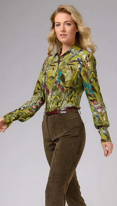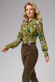 Блуза прилегающего силуэта с широкими манжетами и отложным со стойкой воротником. Красочный принт в модных природных оттенках.