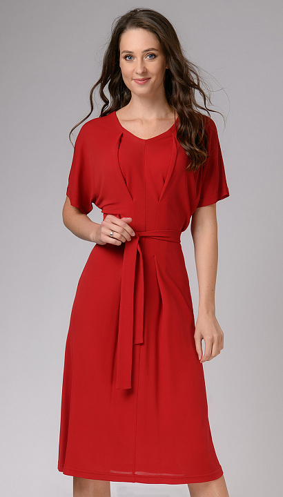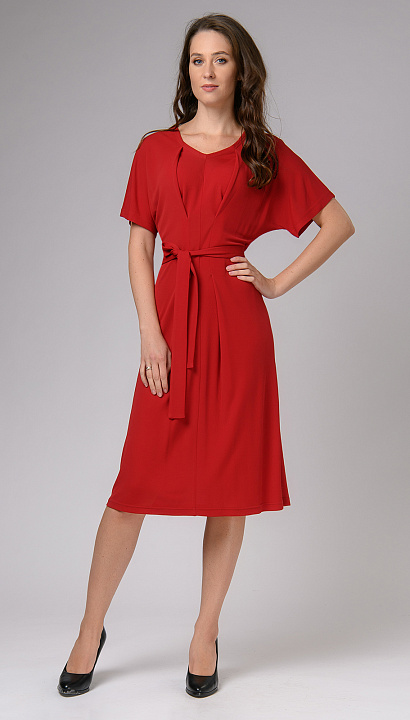 Платье из приятной к телу вискозы привлекает к себе внимание за счет яркого красного цвета и интересного кроя. Защипы визуально вытягивают силуэт.