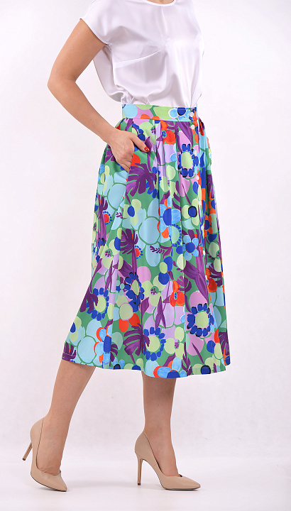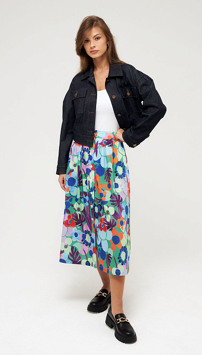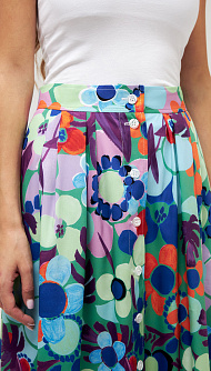 Длинная юбка с заложенными мягкими складками, с карманами в боковых швах, на пуговицах спереди, с ярким цветочным принтом.