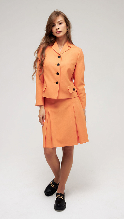 Короткая юбка трапеция с 2-мя встречными складками на передней половине юбки и клапанами с контрастными чёрными пуговицами и отделочной строчкой по краю.