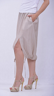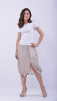 Легкая юбка ниже колена приятного бежевого оттенка с кулиской по низу прекрасно подходит для теплых дней. Она понравится многим для создания красивых летних образов. Модель хорошо сочетается с футболками, рубашками, топами, блузами. Качественный материал обеспечивает комфорт и долговечность. Если вы – владелец розничной точки продаж и ищете стильное решение для расширения ассортимента, купите летние юбки оптом от производителя «Петербургский стиль». Так вы сможете оперативно предложить своим клиентам современный и практичный вариант! Купить юбку с разрезом можно по доступной цене.